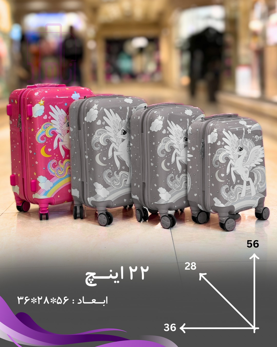 چمدان در اندازهای ایدهآل ۲۲ اینچ (۵۶*۲۸*۳۶)طراحی شده است که فضای کافی برای لوازم ضروری کودک را فراهم میکند، اما همچنان سبک و قابلحمل است.